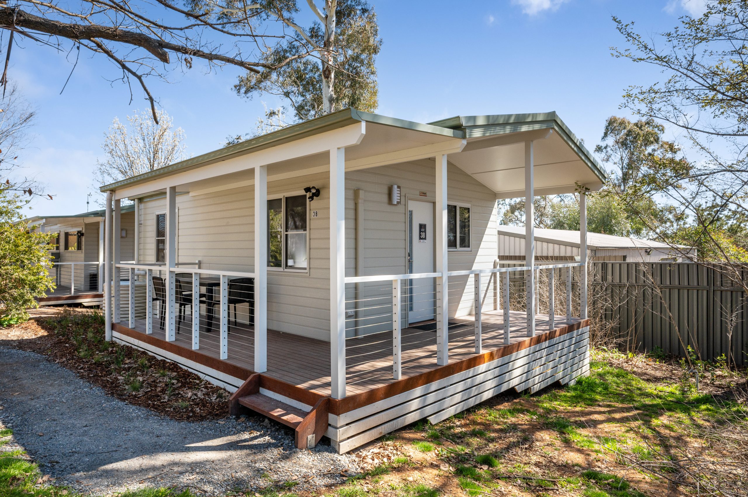 Our Two-Bedroom Cabin is ideal for families or small groups, featuring a queen bed in the main bedroom and single bunks in the second bedroom. The cabin includes a full kitchen with a full-sized fridge, plus a bathroom with a shower. Step outside onto your private deck with an outdoor setting, perfect for enjoying the fresh air.